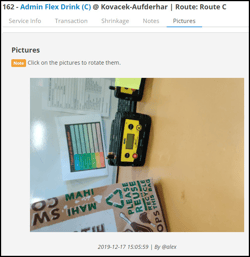 Esta pestaña muestra todas las imágenes de la máquina para el servicio utilizando la aplicación Driver o el Portal Driver. Una marca de tiempo para cada imagen se encuentra debajo de la imagen, así como el nombre de usuario del usuario que tomó la imagen. Para girar la imagen en sentido horario, haga clic en la imagen.
