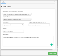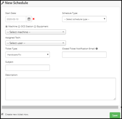 In the following pop-up, you can designate whether the ticket is for a machine, OCS Station, or equipment. You can fill in any additional information as needed, and enter an email to be notified when the ticket is marked as closed.