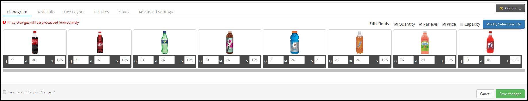 Esto le permite realizar cambios rápidos en la Cantidad (Q), Parlevel (PL), Precio ($) y/o Capacidad (C).