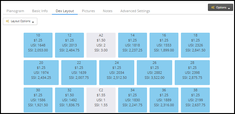Asigne un nuevo planograma: (si corresponde) Si el diseño de esta máquina coincide con el diseño de un planograma guardado, verá este menú desplegable disponible en Adv. Configuraciones Si esta opción no aparece, existe una discrepancia en el diseño de las máquinas y debe verificarse.