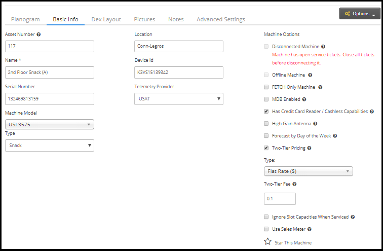 La pantalla Editar máquina es donde puede realizar cambios rápidos en el inventario o editar información más detallada sobre la máquina. Se puede acceder a Machine Edit haciendo clic en el icono en el extremo derecho de una máquina en la página Todas las Máquinas, o en la Vista de máquina, a la que se puede acceder desde cualquier lugar en el VMS donde se puede hacer clic en el nombre de la máquina. Para obtener información sobre la Vista de máquina, consulte Vista de máquina: en línea y Vista de máquina: sin conexión.
