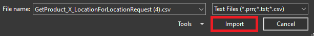 - Select the GetProductsReportRequest.csv and then select import.
