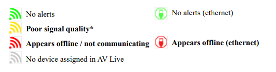Hovering the cursor over a status icon displays a tooltip indicating when the last ping occurred and its RSSI (received signal strength indicator, in dBm). Reading and understanding the displayed RSSI requires the following considerations: