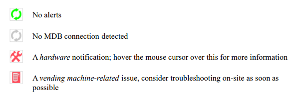 The second status column (third column from the left) displays icons related to MDB Status (device-to-machine) and displays with various icons, including: