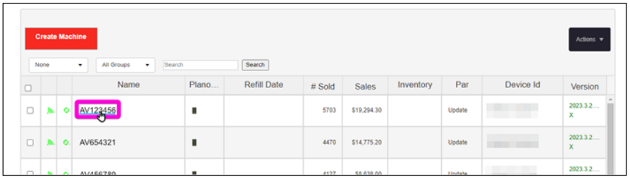 To search for a machine, navigate to your Machines screen, found at https://live.app.air-vend.com/Machine. The list of machines may be scrolled through, or you may enter the serial number in the Search field near the top.