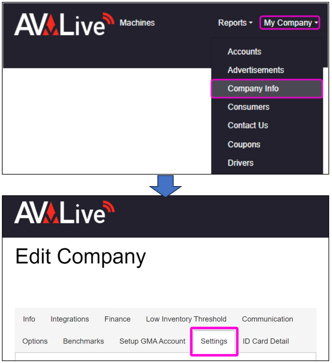 To view and edit the default settings for new devices, navigate to [My Company > Company Info]. This displays the Edit Company screen, where you will then click on the Settings tab.