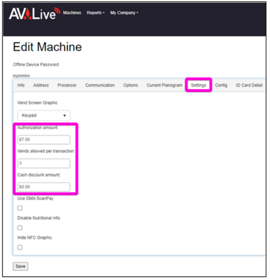 The most commonly adjusted settings are the Authorization Amount, Vends allowed per transactions, and Cash discount amount (two tier fee).