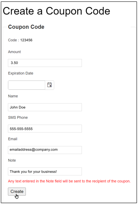 - Enter a valid email address or phone number so that the coupon may be sent to the intended customer. Entering a phone number into the SMS Phone field will send the coupon code via text message.