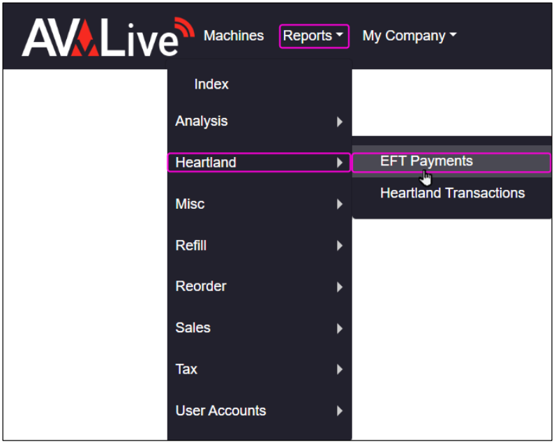 To view Heartland EFT payments, navigate to [Reports > Heartland > EFT Payments].