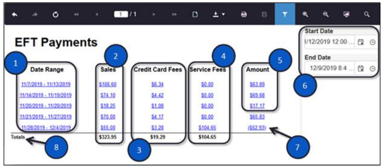- The Start Date and End Date fields on the right allow you to run the EFT payment for a custom date range and show all EFT payments, credit card fees, and service fees for the range specified.