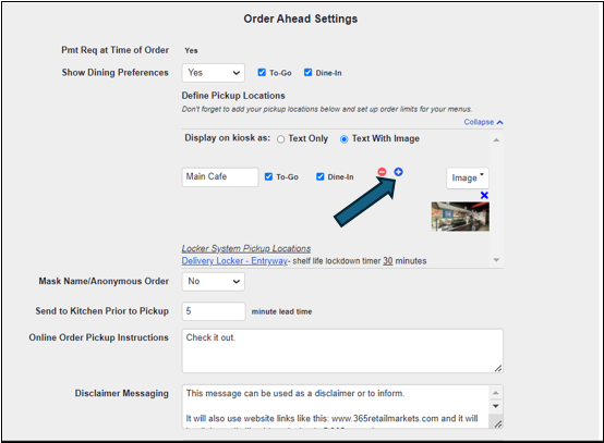 - Select the radio button Text with Image to upload a picture to associate with the pickup location, which will show on the kiosk in Order Ahead mode.
