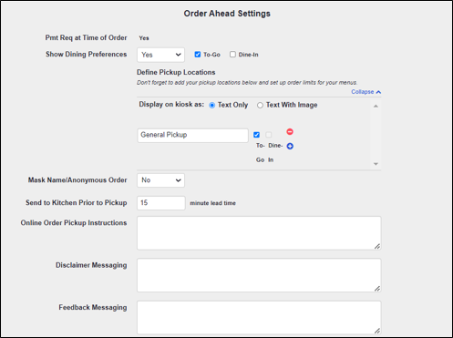 - Scroll down to the Order Ahead Settings section, which defines the settings for the café pickup location. By default, the café location is named General Pickup, but is editable.