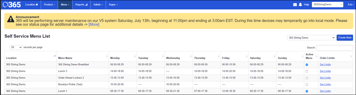 - Set the Start Time and End Time for the menu at the top, as well as select the size of the timeslots in 5 minute increments between 5 and 30 minutes.