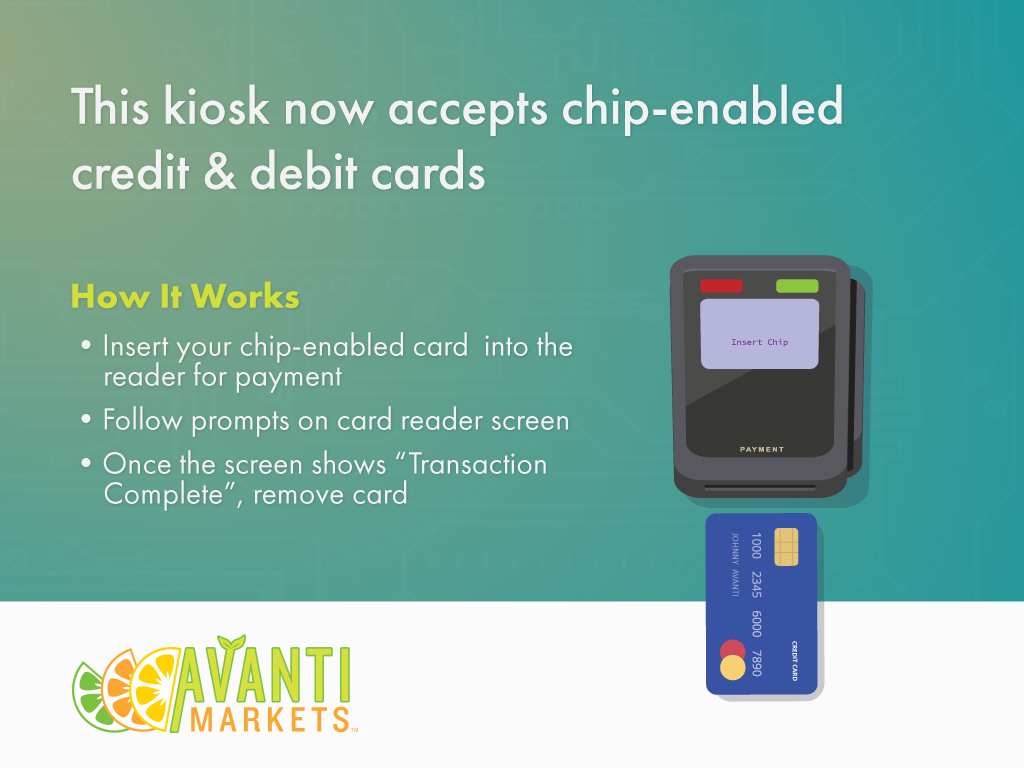 Chip enabled credit and debit cards are one of the strongest protection for consumers' card data. Avanti Markets is enabling this feature on market kiosks this summer.