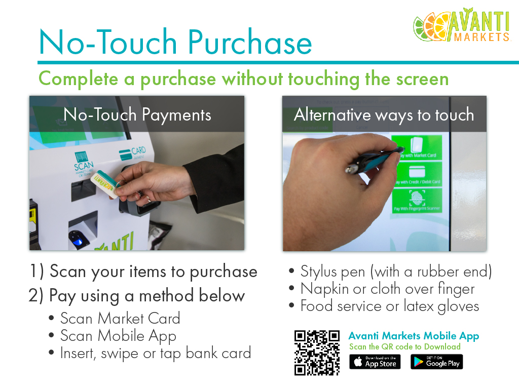 Remind market users that they can make a purchase without touching the kiosk screen by scanning items and then scanning mobile app or market member card.
